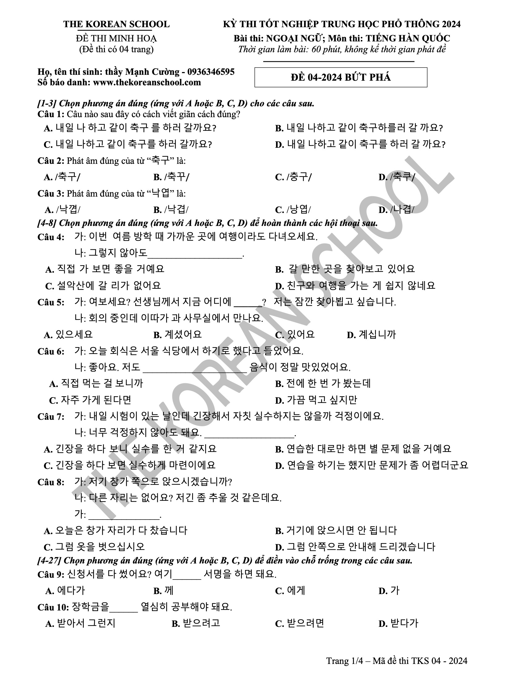Mọi thắc mắc xin liên hệ Fanpage: https://www.facebook.com/thekoreanschool