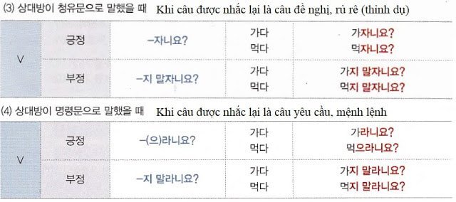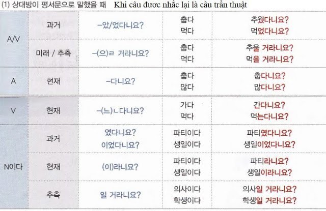 Sử dụng cấu trúc này khi người nói ngạc nhiên hoặc không tin điều người khác nói là đúng, là thật. Cấu trúc này lặp lại lời của đối phương để diễn tả cảm giác, cảm nhận, sự ngạc nhiên của người nói, chính vì thế hình thức này giống như câu trích dẫn gián tiếp và sẽ có hình thức thay đổi tùy theo loại câu của câu được trích dẫn. Đuôi câu sẽ là -니요?