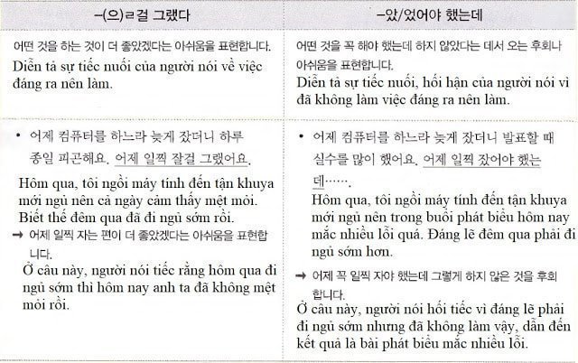 Cấu trúc -(으)ㄹ걸 (그랬다) và -았/었어야 했는데 được sử dụng tương tự nhau nhưng cũng có sự khác biệt.