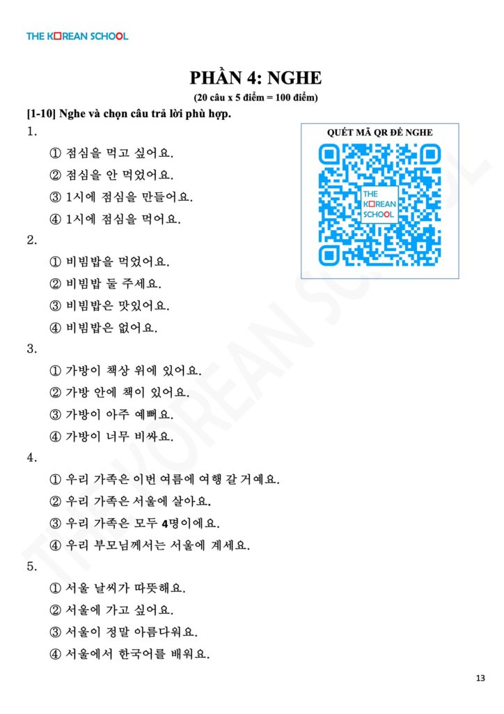 Hãy ghi đáp án dưới comment nhé! Các bạn có thể làm và đối chiếu với đáp án nhé. Mọi thắc mắc xin gửi về Fanpage của Trung tâm tiếng Hàn The Korean School để các thầy cô chấm nhé!