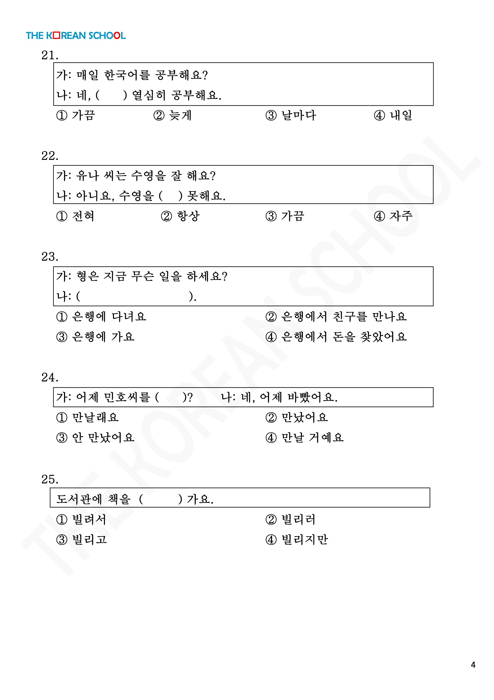 Hãy cùng The Korean School làm thử đề thi ôn tập tiếng Hàn Sơ cấp 1 để ôn lại những từ vựng, ngữ pháp tiếng Hàn vừa học nhé!
